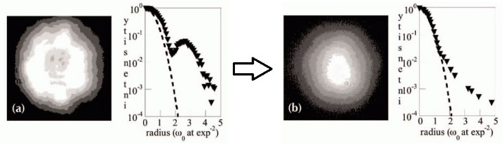 The profiles of the amplified beam before (a) and after (b) the use of the micro optics to re-shape the pump mode are shown using an eight color gray scale and across a dynamic range of four orders of magnitude. The profile of the focus is shown with a gaussian whose near field profile has the same FWHM energy content.
